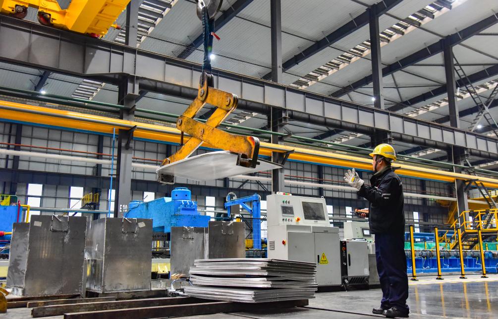 义瑞新材料公司车间内,机械吊臂在工人指挥下吊卸铝板。新华社发