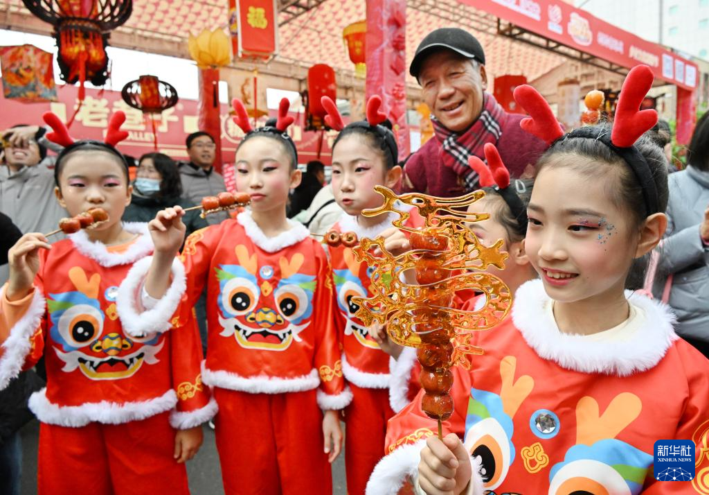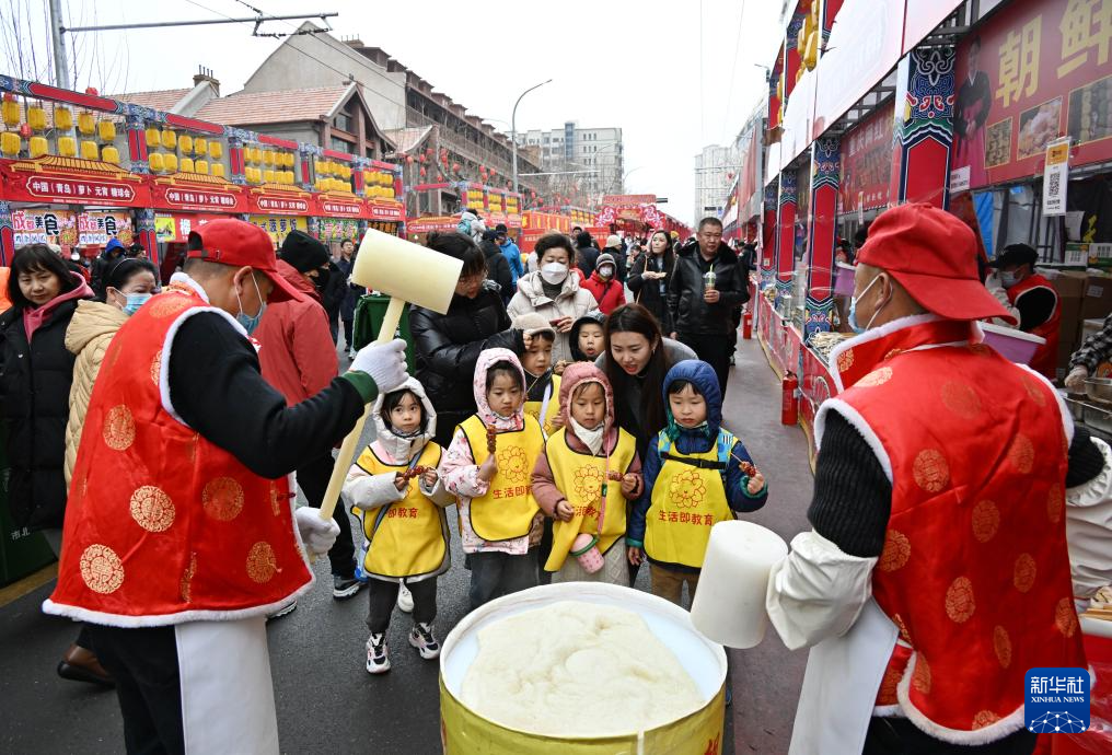 2月18日,小演员在萝卜·元宵·糖球会上品尝糖球。