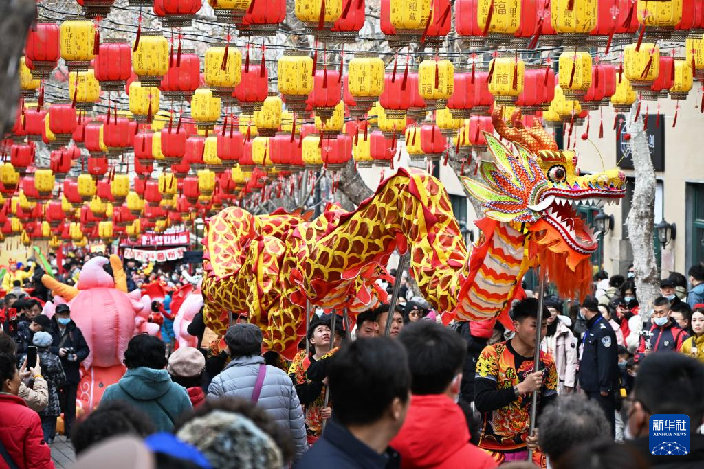 2月18日,游客在萝卜·元宵·糖球会上观看舞龙表演。