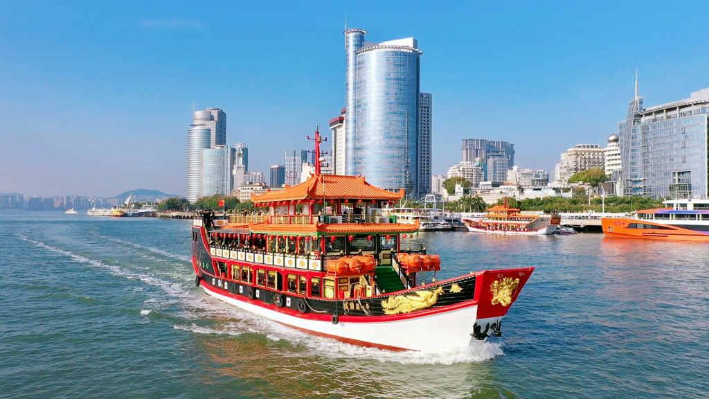 上午10时许,一艘闽南复古龙船造型的游船从厦门和平码头缓缓驶入鹭江,两岸一边是繁华的现代化高楼,另一边是世界文化遗产鼓浪屿,游客目之所及,美不胜收。经过规范升级的“厦门海上游”项目,自今年春节全新亮相以来,受到人们追捧。