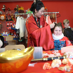 2月24日,小朋友在比利时班什举行的“金龙迎新——2024比利时生肖设计展”期间体验汉服妆造。(新华社记者赵丁喆摄)