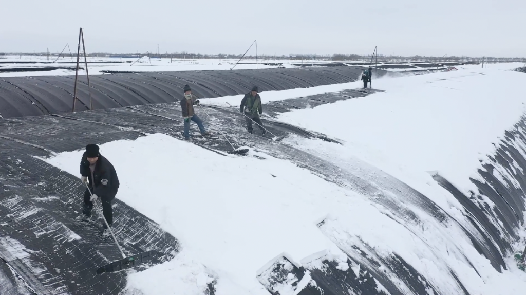 初春遇飞雪,寒潮忙春管。在河北省青县振西蔬菜种植专业合作社,工人们协作劳动,在棚顶忙着清理积雪,在棚内忙着管理瓜秧。