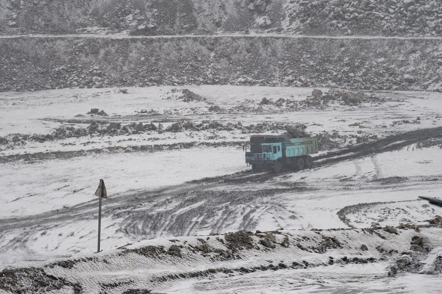 2023年11月16日,在位于鹤岗市萝北县的中国五矿集团(黑龙江)石墨产业有限公司云山石墨矿内,纯电动矿卡在运输石墨矿石原石。新华社记者 谢剑飞 摄