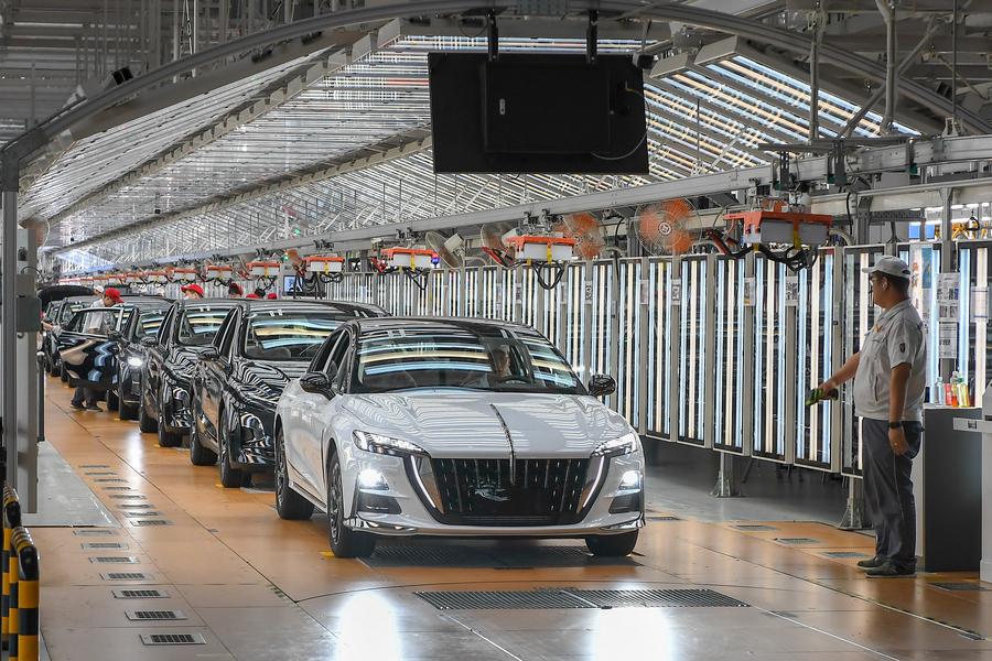 工人在位于吉林长春的一汽红旗繁荣工厂总装车间检查车辆(2023年7月6日摄)。记者 张楠 摄