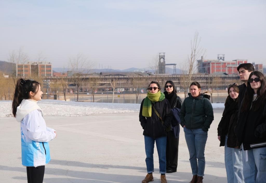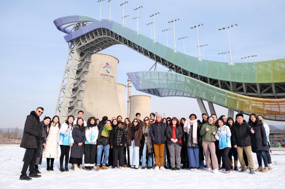 中法青年志愿者参观首钢滑雪大跳台。(新华社记者 胡梦雪 摄)