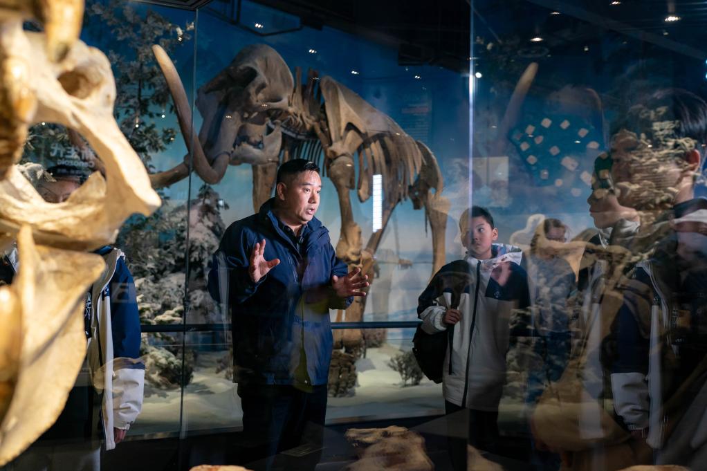 郭进(右一)在澄江化石地世界自然遗产博物馆为观众讲解生命演化知识(2月22日摄)。