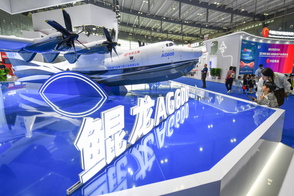 在湖南长沙国际会展中心举办的2023湖南(国际)通用航空产业博览会上,参观者在中国航空工业集团有限公司展位参观“鲲龙”AG600模型(2023年9月22日摄)。新华社记者 陈泽国 摄