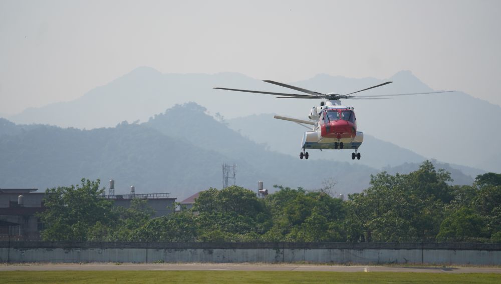 在江西景德镇吕蒙机场,中国航空工业集团有限公司自主研制的大型多用途民用直升机“吉祥鸟”AC313A直升机首飞成功(2022年5月17日摄)。新华社记者 胡晨欢 摄