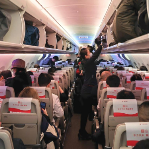 2月5日,国产大飞机C919执飞的东航航班上,乘务员正为旅客放置行李。今年是国产大飞机C919首次服务春运。新华社记者 王聿昊 摄