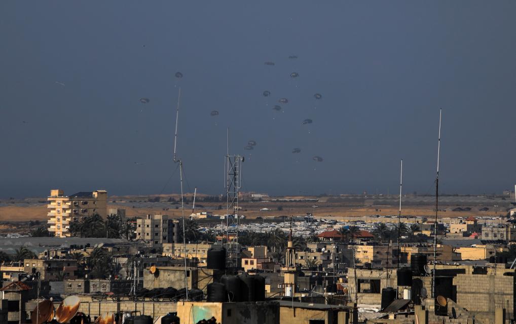 这是2月27日拍摄的向加沙地带空投的救援物资。约旦武装部队27日发表声明说,约旦皇家空军当天向巴勒斯坦加沙地带空投了一批救援物资。新华社发(亚西尔·库迪摄)