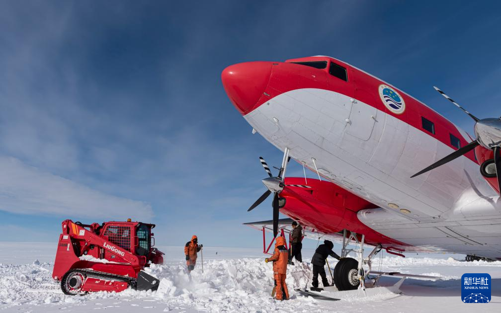 2月6日,暴风雪后,中国第40次南极考察队员为“雪鹰601”清理积雪。新华社发(裴文悦摄)