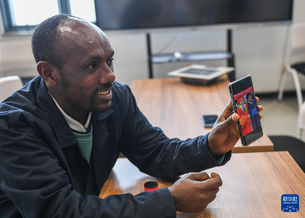 2月15日,在亚的斯亚贝巴的埃塞俄比亚联邦职业技术培训学院,鲁班工坊当地教师约纳斯·阿凯莱(中文名艾友涵)展示在中国学习时的照片。