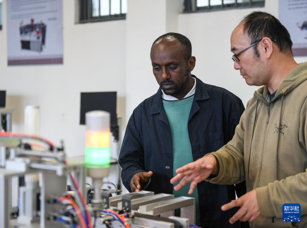 在埃塞俄比亚首都亚的斯亚贝巴的鲁班工坊实训室内,一只工业机器人手臂正在抓取实物,模拟流水线生产。借助来自中国的机电一体化控制平台,当地教师约纳斯·阿凯莱(中文名艾友涵)向学生们讲解了自动化设备的操作和运行。