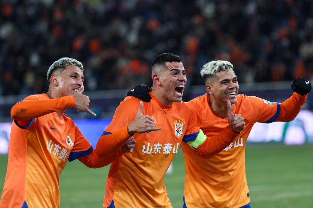 3月1日,山东泰山队球员贾德松(中)和队友帕托(右)、克雷桑庆祝进球。新华社记者 朱峥 摄