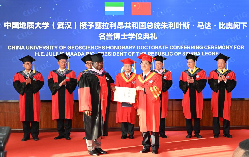 3月2日,塞拉利昂总统比奥(左四)在中国地质大学(武汉)接受名誉博士学位。新华社记者 程敏 摄