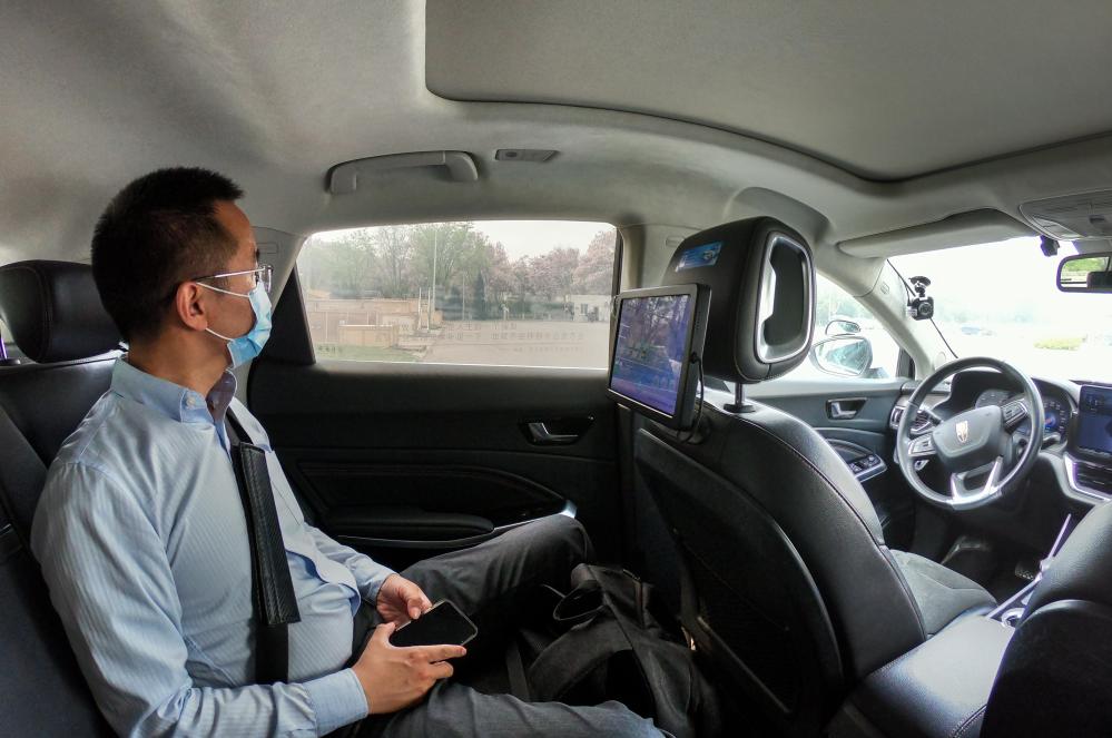 在北京经济技术开发区,一名男子在体验“主驾无人、副驾驶配备安全员”的自动驾驶车(2022年4月25日摄)。新华社记者 彭子洋 摄