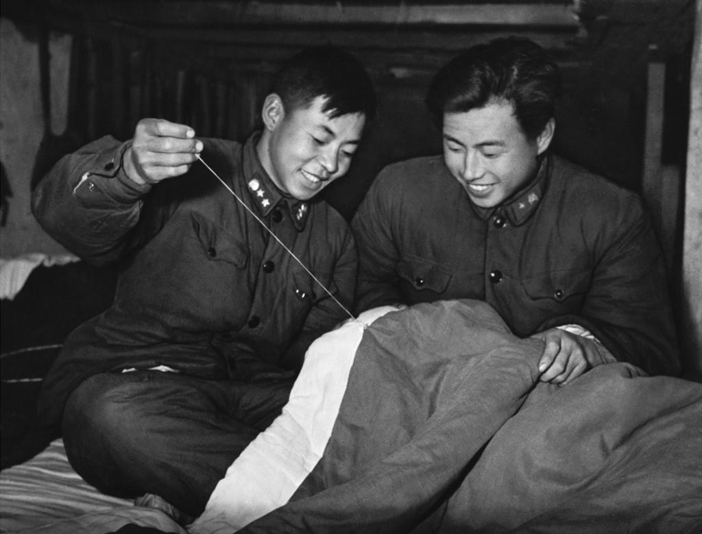 ↑1959年2月,雷锋所在鞍钢洗煤车间吊车组被评为红旗组,这是雷锋(后排右二)和工友合影。