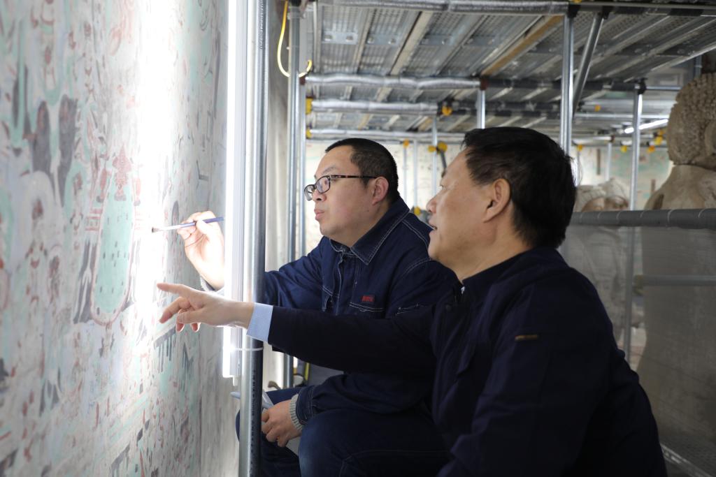 在莫高窟第55窟内,汪万福(右)正引导敦煌研究院壁画修复人员检查去年修复的病害壁画。新华社记者李杰 摄