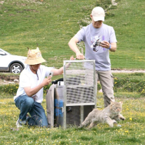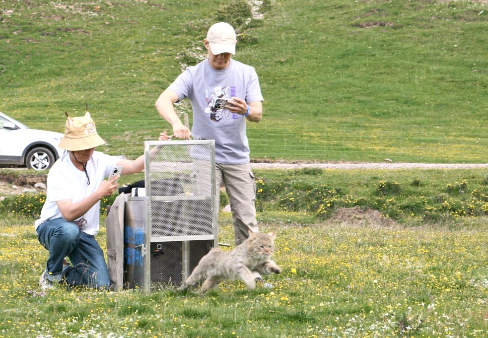 2023年7月23日,在青海省海北藏族自治州海晏县,西宁野生动物园副园长齐新章(左一)和中国农业大学动物医学院副院长金艺鹏放归荒漠猫“黄太急”。(西宁野生动物园供图)
