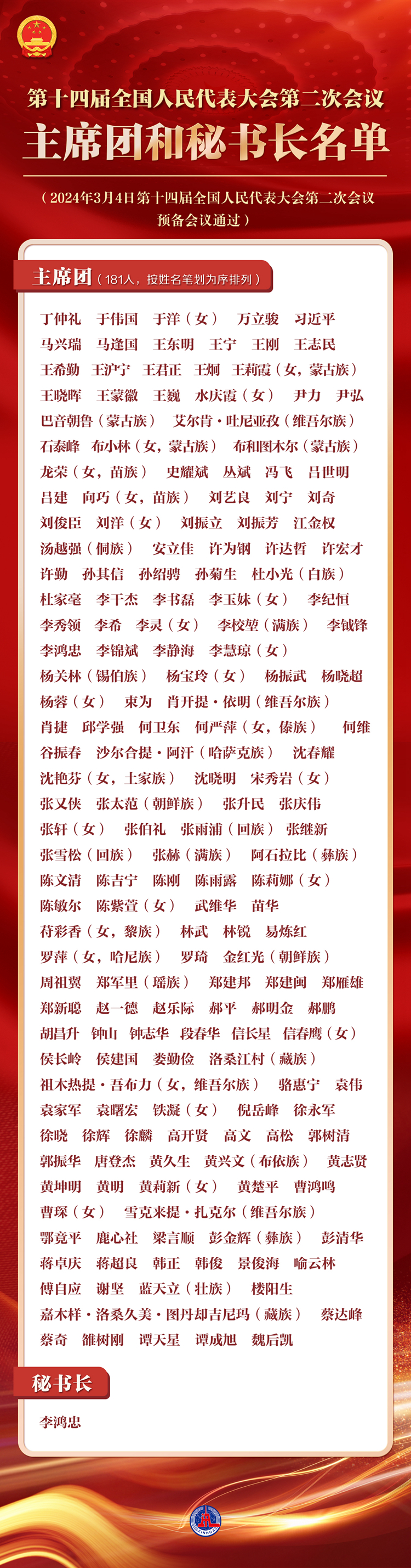 两会受权发布丨第十四届全国人民代表大会第二次会议主席团和秘书长名单_2024全国两会大型融媒体专题_新华网