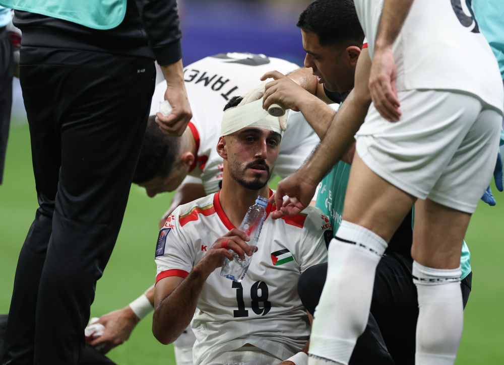 1月29日,巴勒斯坦队球员穆哈那头部受伤后接受治疗。当日,在卡塔尔海湾球场举行的男足亚洲杯八分之一决赛中,卡塔尔队2:1战胜巴勒斯坦队,晋级八强。新华社记者 贾浩成 摄