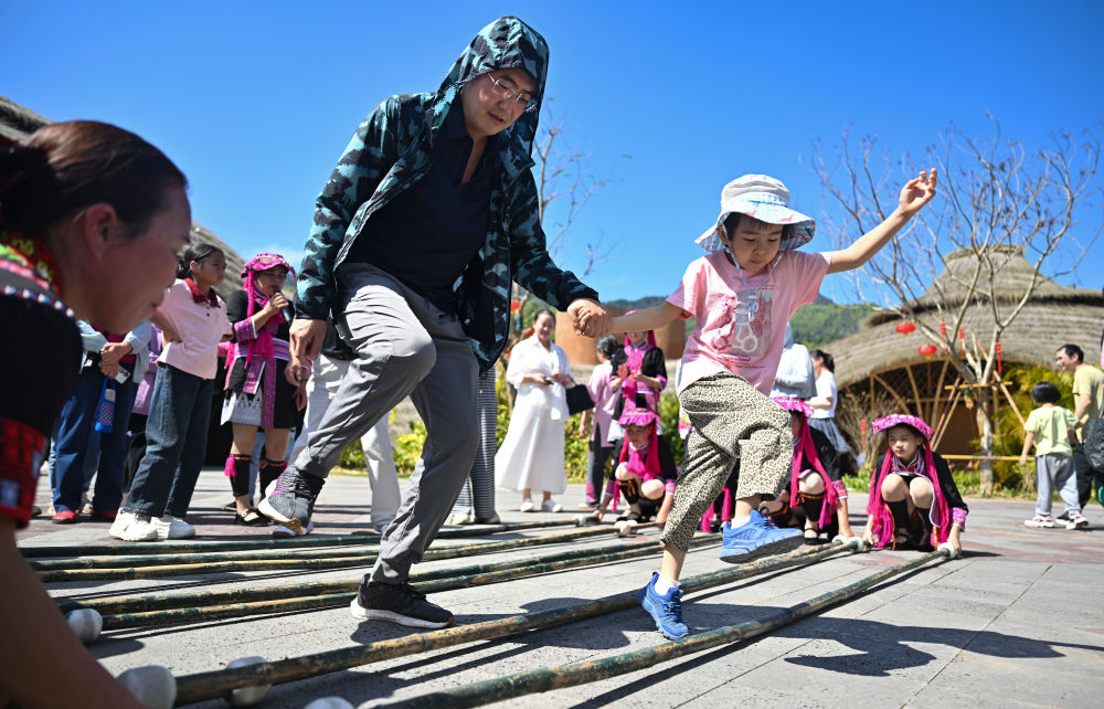 2024年2月14日,游客在海南省五指山市水满乡毛纳村体验竹竿舞。新华社记者 郭程 摄