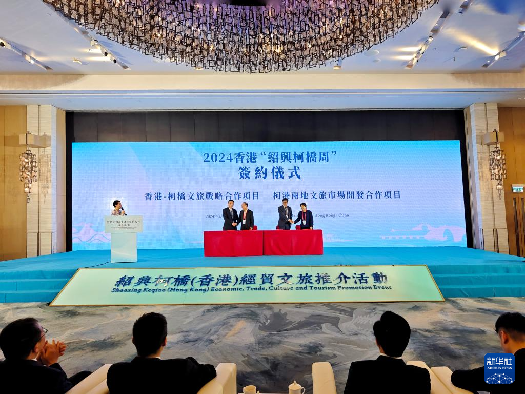 3月6日,2024香港绍兴柯桥周经贸文旅推介会在香港举行,来自香港特区与浙江省绍兴市柯桥区的有关单位在会上签署纺织数字智造、文旅开发、水处理系统等方面5个合作项目。新华社发