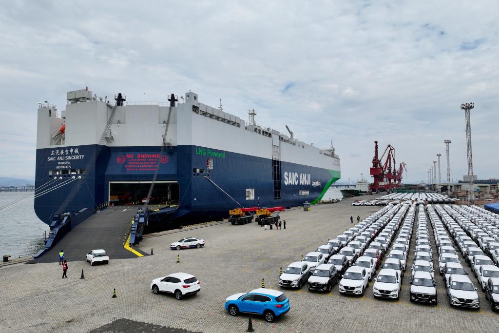 2024年1月23日,在福建厦门东渡港区现代码头,出口车辆陆续驶上“上汽安吉申诚”号汽车滚装船(无人机照片)。新华社记者 姜克红 摄