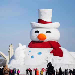 2月24日,在哈尔滨太阳岛雪博会园区门口,游客在大雪人前留影。新华社记者 王建威 摄