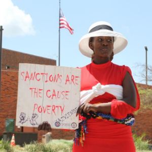 3月5日,在津巴布韦首都哈拉雷,一名女子手持标语牌站在美国驻津巴布韦大使馆门前参加反对制裁的集会活动。新华社发(塔法拉·穆瓜拉摄)