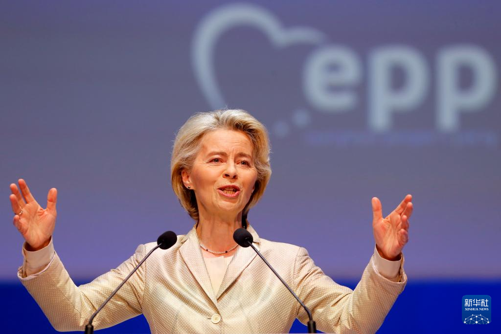 3月7日,在罗马尼亚首都布加勒斯特,欧洲联盟委员会主席乌尔苏拉·冯德莱恩发表讲话。欧洲人民党7日在罗马尼亚首都布加勒斯特进行了党主席的选举,决定提名现任欧洲联盟委员会主席乌尔苏拉·冯德莱恩为领衔候选人,代表该党参加6月的欧洲议会选举。新华社发(克里斯泰尔摄)