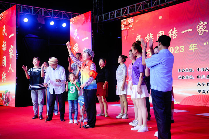 情景剧《邻里和睦一家亲》,描绘了社区这个大家庭里,各族群众像石榴籽一样紧紧抱在一起,积极构建共居共学、共建共享、共事共乐的互嵌式社会环境的故事。2023年8月31日晚,永宁县举行2023年“民族团结进步月”启动仪式。(自治区党委宣传部供图)