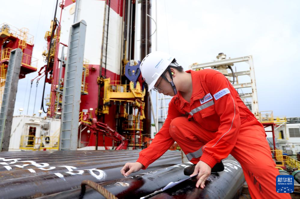 作业人员在开平南油田“深蓝探索”钻井平台上测量套管(2023年9月12日摄)。新华社发