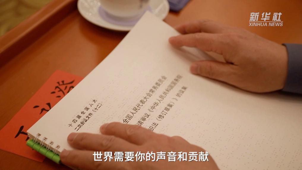 首位盲人全国人大代表王永澄,拿到一份特别的政府工作报告。他一边认真聆听报告,一边用双手仔细摩挲着这份更显厚重的文件,难掩激动之情。