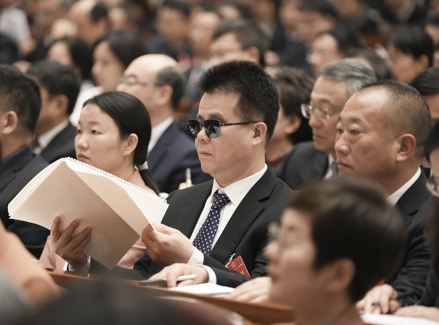 在十四届全国人大二次会议开幕会上,王永澄代表用手指阅读盲文版大会文件(3月5日摄)。