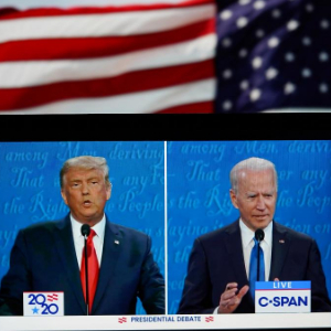 这张2020年10月22日在美国弗吉尼亚州阿灵顿拍摄的视频画面显示,时任美国总统特朗普(左)与当时的民主党总统候选人拜登在田纳西州纳什维尔市参加最后一场总统候选人电视辩论。新华社记者刘杰摄
