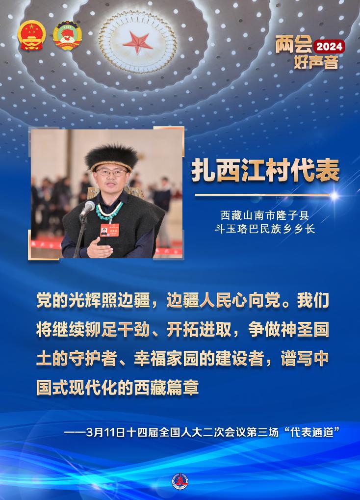 “西藏有这样一句谚语,‘幸福与否在双手,温暖与否看太阳’。党的光辉照边疆,边疆人民心向党。”扎西江村说,“我们将继续铆足干劲、开拓进取,争做神圣国土的守护者、幸福家园的建设者,谱写中国式现代化的西藏篇章。”
