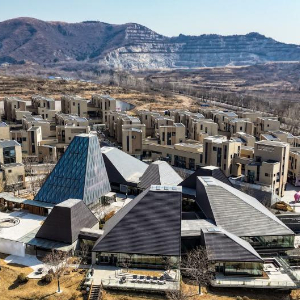 天津市蓟州区位于燕山山脉南麓,曾是京津地区主要建材产地,经年累月无节制地采矿后,近乎垂直的大片裸露创伤崖壁与周边郁郁葱葱的绿色植被形成鲜明对比,成为当地生态修复的一大难题。近年来,蓟州区陆续关停了数百家污染企业,大力开展废弃矿坑和山体修复,将多个历史遗留矿区纳入治理范围。如今,曾经的峭壁被修整成平缓的坡面,山体逐渐被新绿覆盖,处处透露着绿色发展理念,“eden春山里”生态教育国际生活示范区(以下简称“春山里”)就在这里落成。