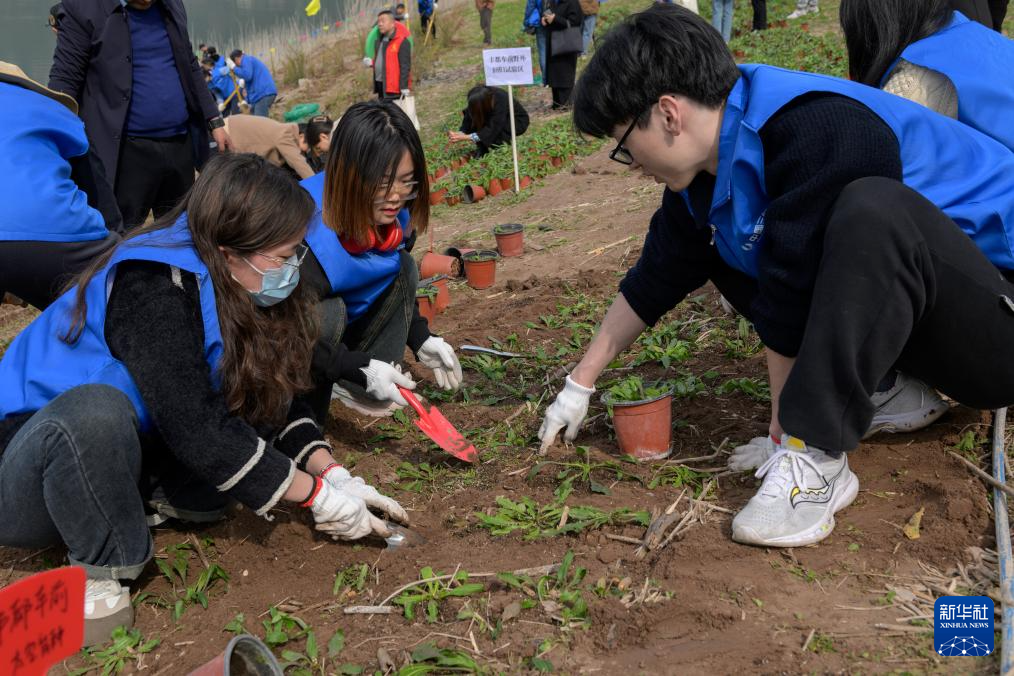 3月12日,在湖北省秭归县郭家坝镇童庄河江心小岛上,三峡大学的学生在栽植丰都车前。新华社记者 胡竞文 摄