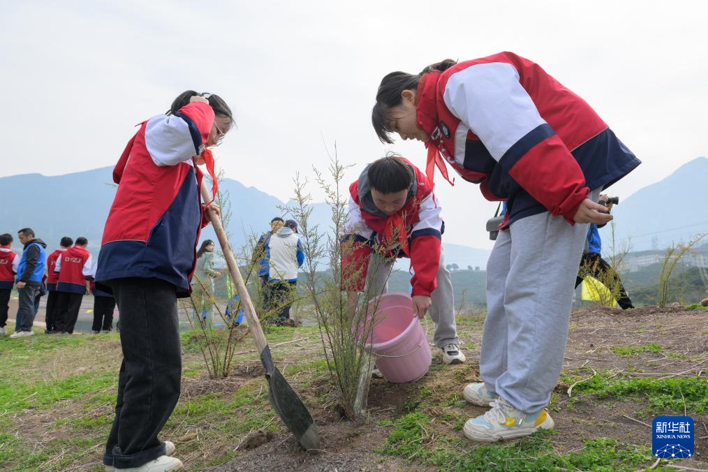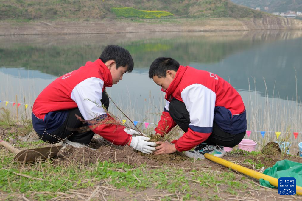 3月12日,在湖北省秭归县郭家坝镇童庄河江心小岛上,秭归县郭家坝镇初级中学的学生在栽植疏花水柏枝。新华社记者 胡竞文 摄