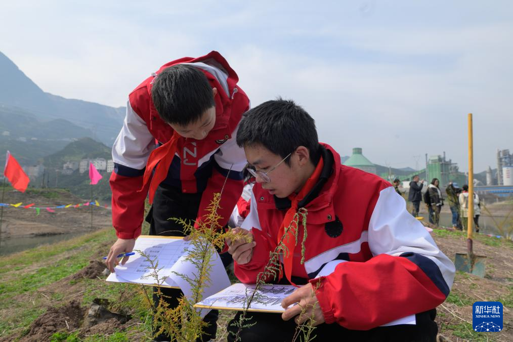 3月12日,在湖北省秭归县郭家坝镇童庄河江心小岛上,秭归县郭家坝镇初级中学的学生在观察栽植的疏花水柏枝。新华社记者 胡竞文 摄