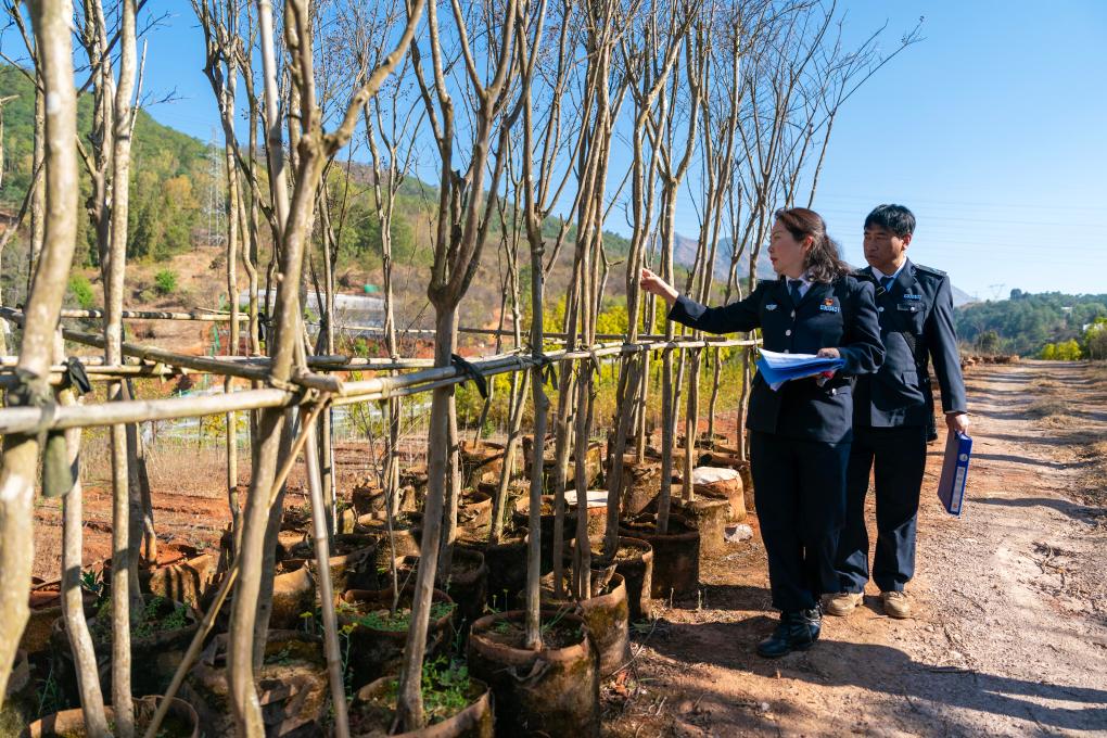 黄云雪(左)与同事句正平在澄江市一家苗圃内查看苗木状况(3月7日摄)。新华社记者 陈欣波 摄