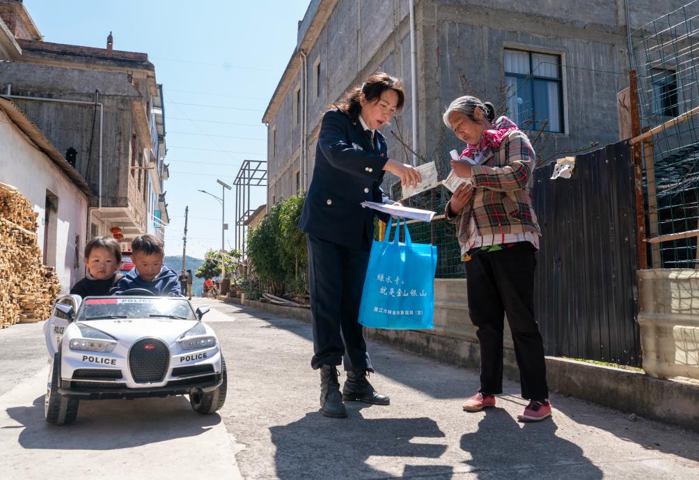 黄云雪(右二)在澄江市一处林区内的村庄向一位村民赠送灭红火蚁的药品(3月7日摄)。新华社记者 陈欣波 摄