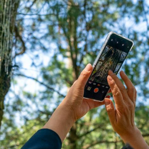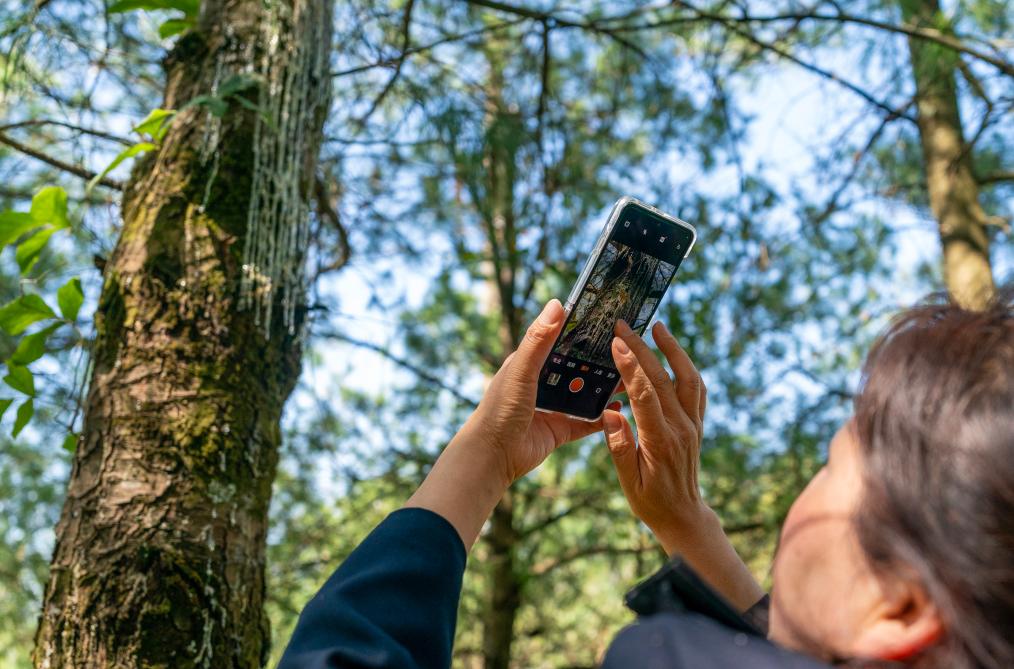 黄云雪在澄江市一处林区内用手机拍摄一棵病树(3月7日摄)。新华社记者 陈欣波 摄