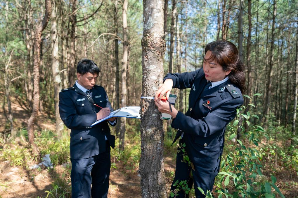 黄云雪(右)与同事句正平在澄江市一处林区测量并记录一棵病死树数据(3月7日摄)。新华社记者 陈欣波 摄