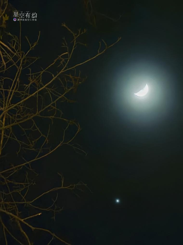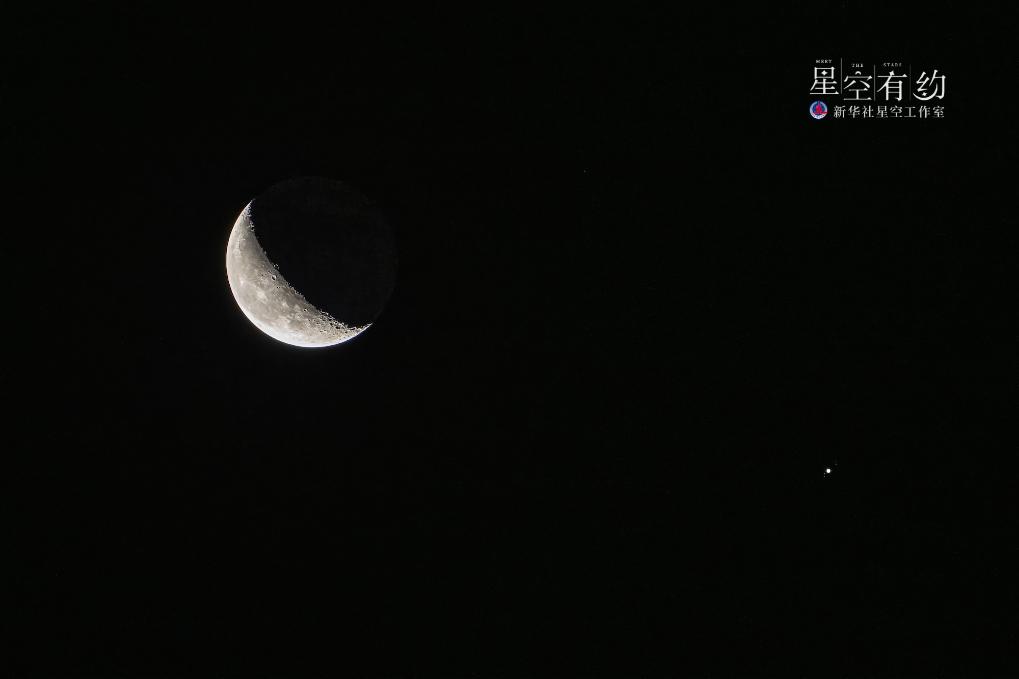 “3月14日为农历二月初五,月相为蛾眉月,木星会在这轮弯弯的月牙下偏左的位置,二者的角距离在7度左右。”杨婧说。