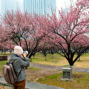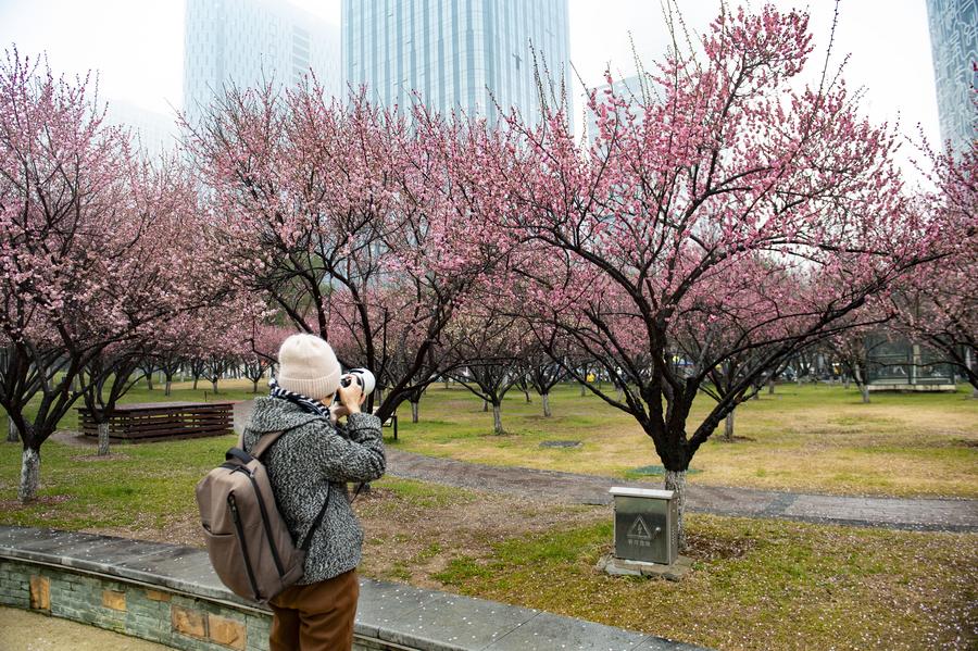 3月5日,市民在位于安徽省合肥市蜀山区的绿轴公园赏花拍照。新华社记者 傅天 摄