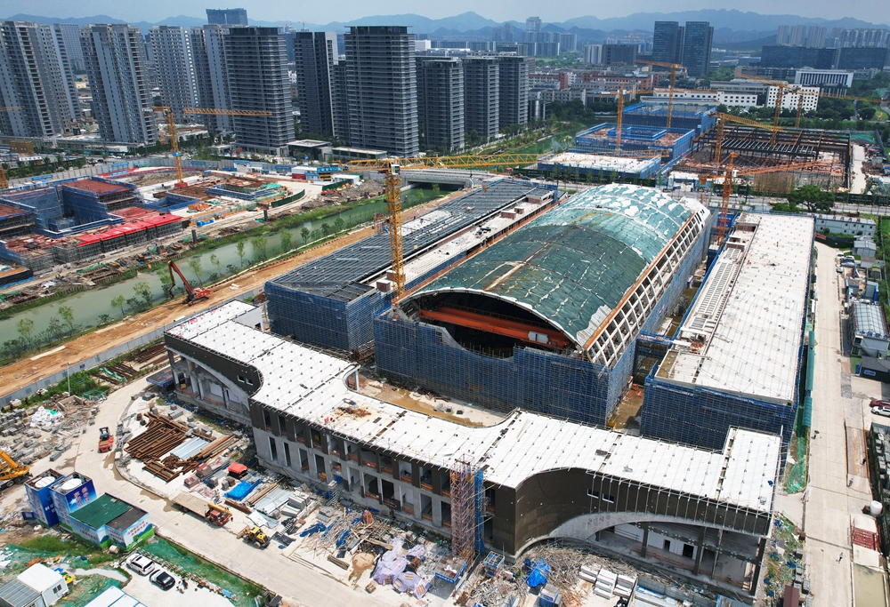 从杭州市余杭区空中俯瞰已封顶的超重力离心模拟与实验装置实验大楼(2023年7月17日摄,无人机照片)。由浙江大学承建的超重力离心模拟与实验装置实验大楼2023年7月16日实现全面封顶。新华社发(龙巍 摄)