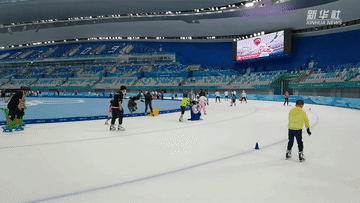 2023年1月6日,小朋友在国家速滑馆进行短道速滑训练展示。