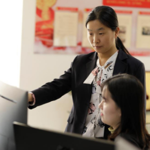 田会静(左)指导团队研究建筑信息模型(BIM)应用技术。